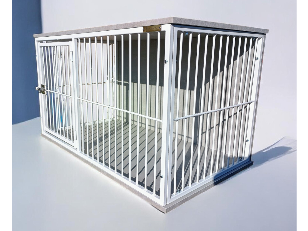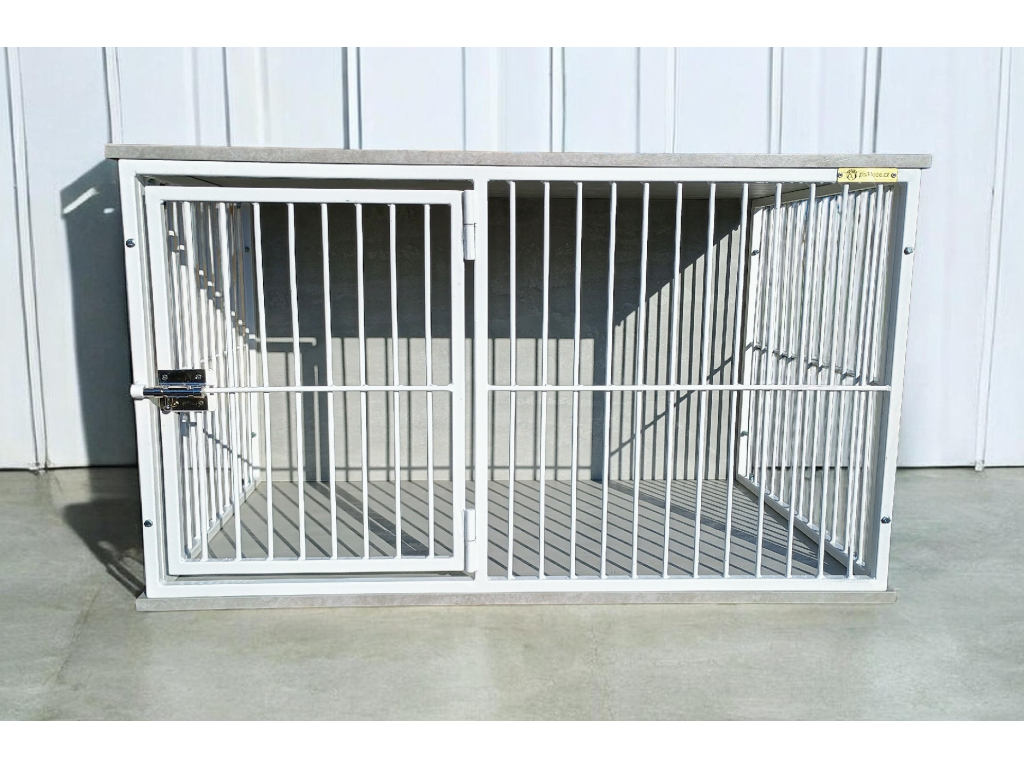 Interiérová klec pro psy – bílé mříže & dekor beton